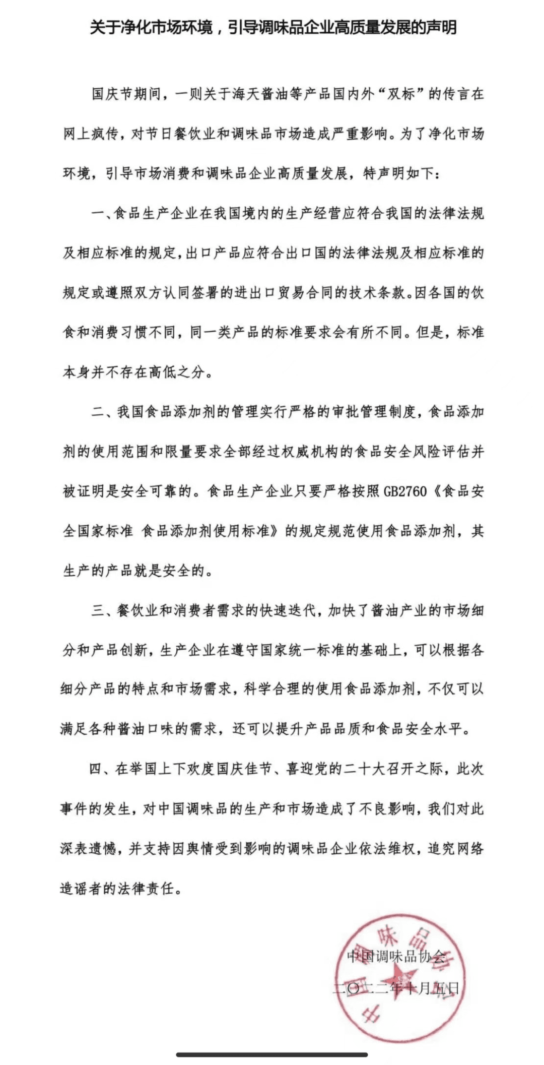 同時,中國調味品協(xié)會表示,“支持因輿情受到影響的調味品企業(yè)依法維權,追究網(wǎng)絡造謠者的法律責任。”