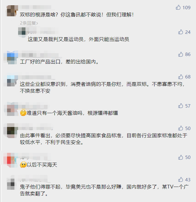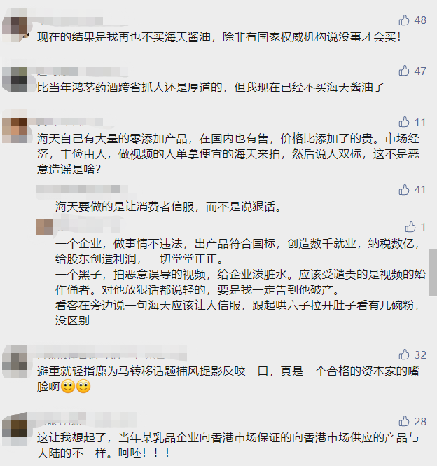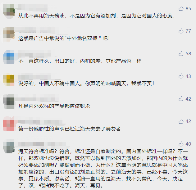 對于被指產品“雙標”,海天味業(yè)在聲明中解釋稱,每個國家和地區(qū)的食品法規(guī)標準不盡相同,對應的產品標識也有不同。產品一國(地區(qū))一標,國內外食品行業(yè)乃至其他很多非食品行業(yè)都是這樣做。隨著多元化消費需求,無論是國內客戶還是國外經(jīng)銷商都會經(jīng)常提出定制產品的需求,定制化產品必然帶來產品標識越來越多,有的品質不一樣,有的品名不一樣。海天產品的內控標準要求大多都高于甚至遠高于國家標準,同一品質的產品,國內國際的內控標準都一致。“用‘雙標’挑起消費者和中國品牌企業(yè)的矛盾對立,不僅打擊了中國老百姓的消費信心,更會影響‘中國造’的世界聲譽。”