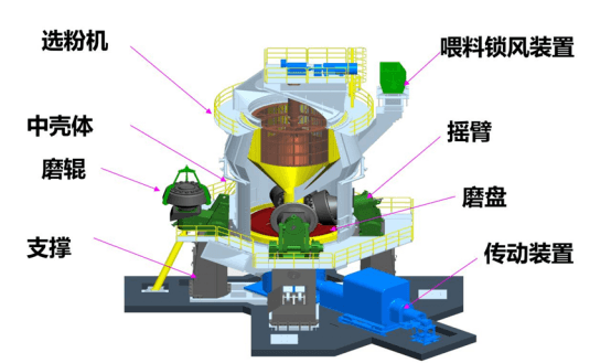 物料從下料口落在磨盤(pán)中央,在離心力的作用下,物料從磨盤(pán)中央向磨盤(pán)邊緣移動(dòng),經(jīng)過(guò)磨盤(pán)的磨損區(qū)域時(shí),受到磨輥的碾壓而粉碎,被粉碎的物料繼續(xù)向磨盤(pán)邊緣移動(dòng),合格的物料將會(huì)被設(shè)備的集塵器收集。