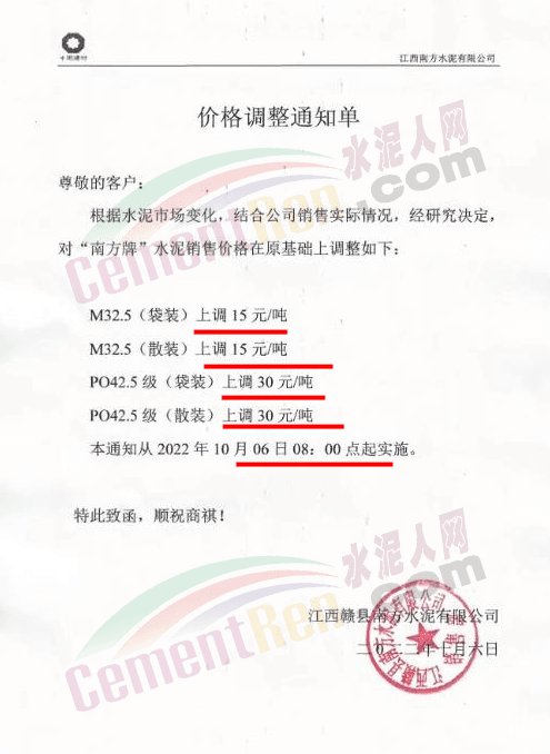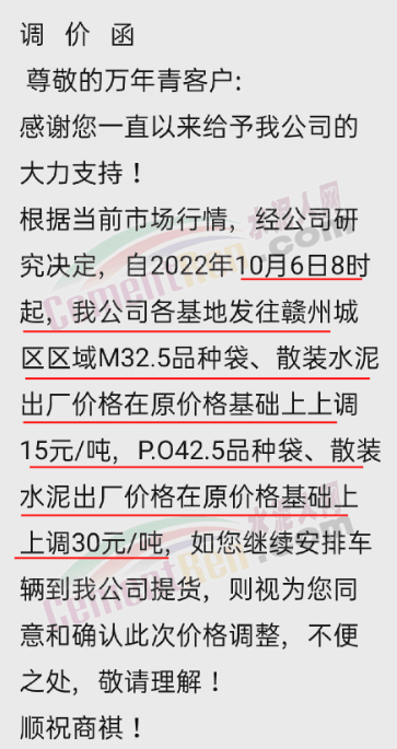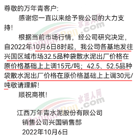 江西萬年青水泥股份有限公司通知,自10月6日8時起,公司各基地發(fā)往贛州城區(qū)以及興國區(qū)域32.5水泥出廠價上調15元/噸,42.5、52.5水泥出廠價上調30元/噸。
