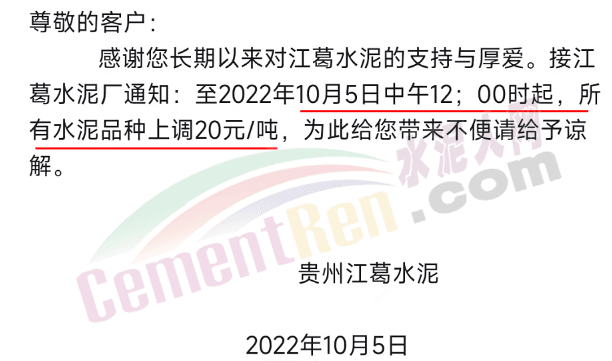 貴州江葛水泥通知,自10月5日中午12時起,所有水泥品種上調20元/噸。