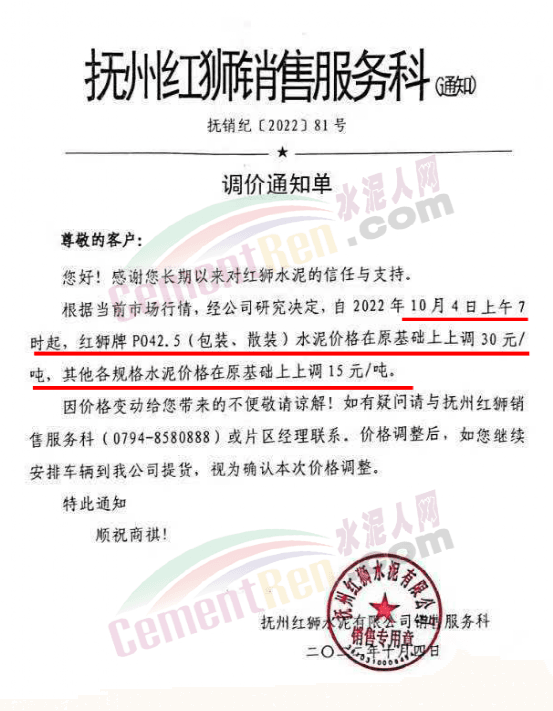 撫州紅獅水泥有限公司銷售服務科通知,自10月4日上午7時起,紅獅牌P.O42.5水泥價格上調30元/噸,其他規(guī)格水泥上調15元/噸。