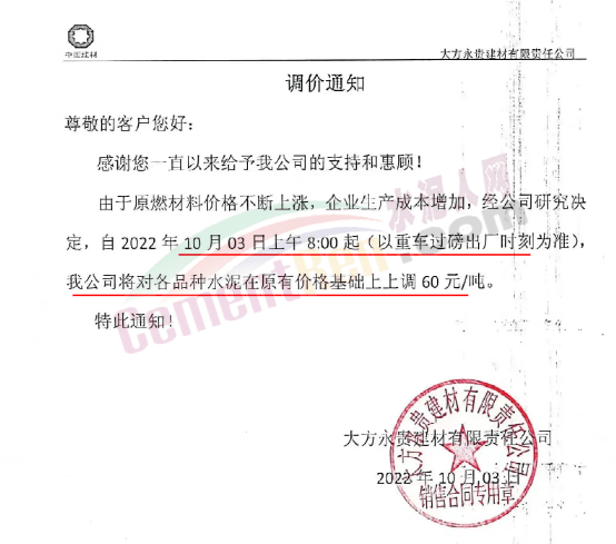 大方永貴建材有限公司通知,自10月3日上午8時起,各品種水泥在原價基礎上上調60元/噸。