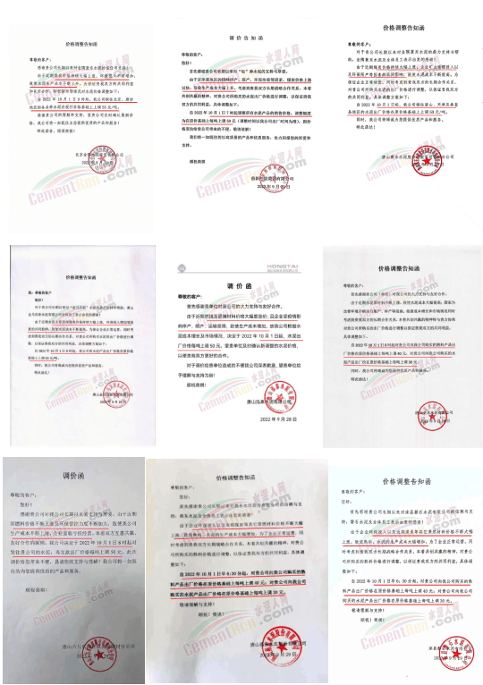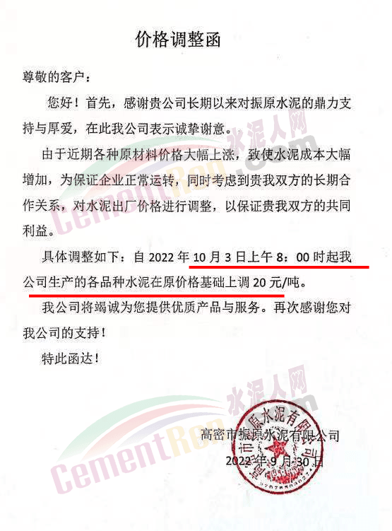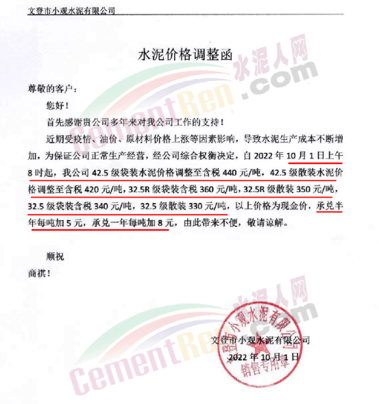 文登市小觀水泥有限公司價格調整函稱,近期受疫情、油價、原材料價格上漲等因素影響,導致水泥生產成本不斷增加,為保證公司正常生產經(jīng)營,經(jīng)公司綜合權衡決定,自2022年10月1日上午8時起,公司42.5級袋裝水泥價格調整至含稅440元/噸,42.5級散裝水泥價格調整至含稅420元/噸,32.5R級袋裝含稅360元/噸,32.5R級散裝350元/噸,32.5級袋裝含稅340元/噸,32.5級散裝330元/噸,以上價格為現(xiàn)金價,承兌半年每噸加5元,承兌一年每噸加8元。