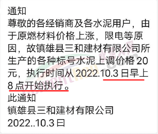 有水泥經(jīng)銷商通知:“8號-22號河南全省停窯,水泥原材料熟料上漲10元-30元,水泥三天內還要漲價,需要囤水泥的趕緊聯(lián)系!”