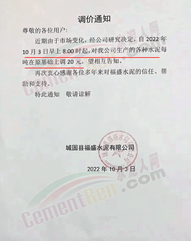 陜西省漢中市城固縣福盛水泥有限公司通知自10月3日早上8時起,對公司生產的各種水泥上調20元/噸。