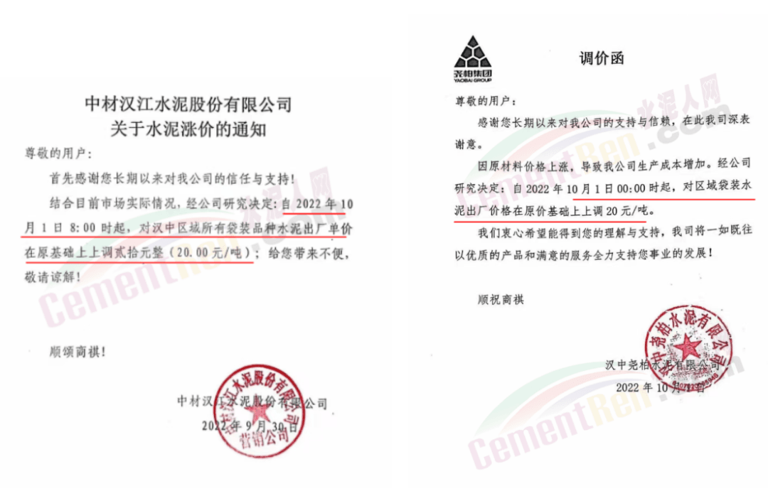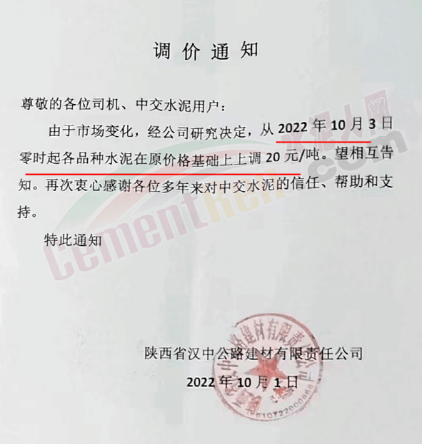 陜西省漢中公路建材有限責任公司通知10月3日零時起各品種水泥在原價基礎上上調20元/噸。