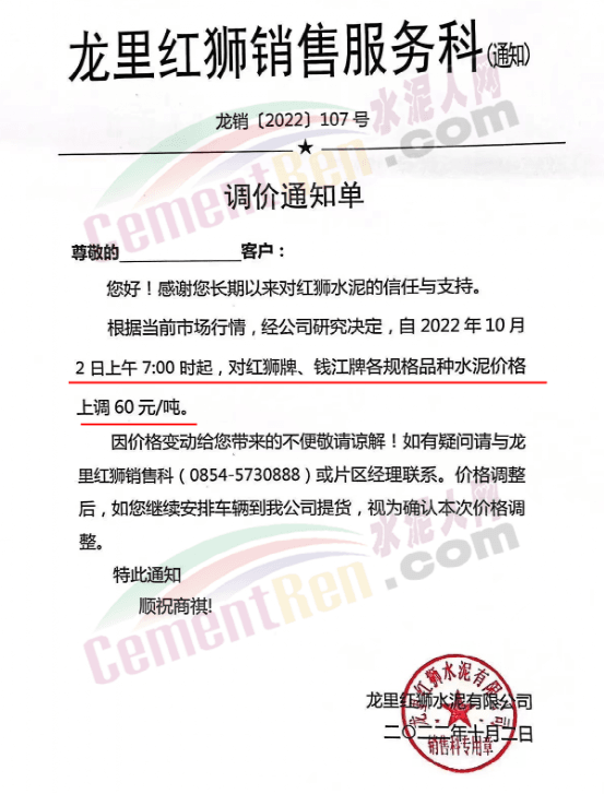 龍里紅獅水泥有限公司通知自10月2日上午7時起,對紅獅牌、錢江牌各規(guī)格品種水泥價格上調60元/噸。