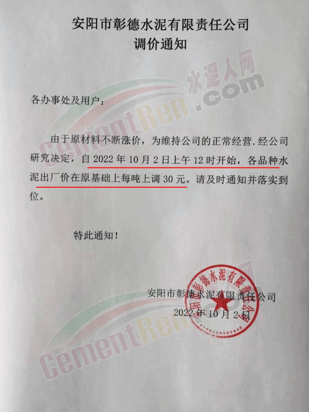 河南安陽彰德水泥有限責任公司通知由于原材料不斷漲價,為維持公司的正常經(jīng)營,經(jīng)公司研究決定,自10月2日上午12時起,各品種水泥出廠價上調30元/噸。