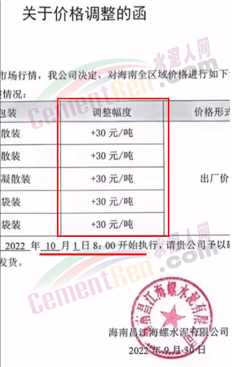海南昌江海螺水泥有限公司通知自10月1日8時起各標號水泥出廠價上調30元/噸。