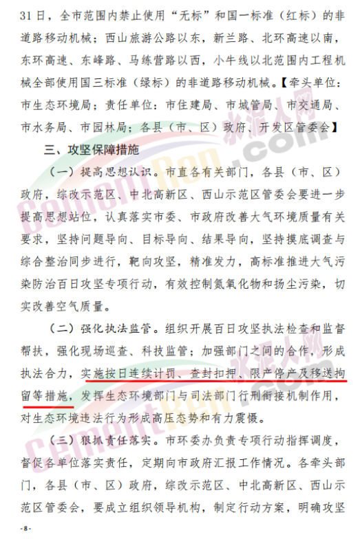 攻堅(jiān)保障措施不僅要求強(qiáng)化執(zhí)法監(jiān)管。實(shí)施按日連續(xù)計(jì)罰、查封扣押、限產(chǎn)停產(chǎn)及移送拘留等措施,發(fā)揮生態(tài)環(huán)境部門與司法部門行刑銜接機(jī)制作用,對(duì)生態(tài)環(huán)境違法行為形成高壓態(tài)勢(shì)和有力震懾。同時(shí),強(qiáng)化輿論引導(dǎo)。由市委宣傳部牽頭,緊緊圍繞全市大氣污染防治工作,開(kāi)展形式多樣的環(huán)境保護(hù)宣傳活動(dòng),提升全民環(huán)境保護(hù)意識(shí)。充分發(fā)揮媒體作用,及時(shí)曝光突出環(huán)境問(wèn)題和整改情況。完善監(jiān)督舉報(bào)、環(huán)境公益訴訟等機(jī)制,鼓勵(lì)和引導(dǎo)環(huán)保社會(huì)組織和公眾參與大氣污染監(jiān)督治理。