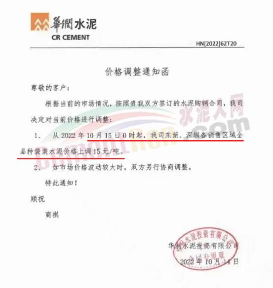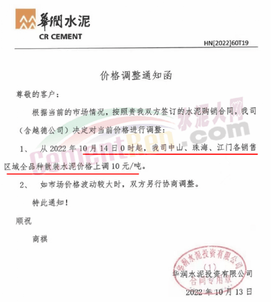 華潤水泥投資有限公司通知10月14日0時(shí)起,公司中山、珠海、江門各銷售區(qū)域散裝水泥價(jià)格上調(diào)10元噸。15日0時(shí)起,公司東莞、深圳各銷售區(qū)域全品種袋裝水泥上調(diào)15元/噸。