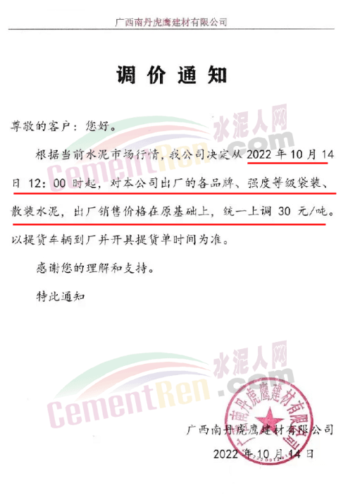 廣西區(qū)域包括海螺、華潤、華新、魚峰、虎鷹水泥在內(nèi)的多家品牌水泥通知于10月14日起,對各品種袋裝、散裝水泥價(jià)格上調(diào)30元/噸。