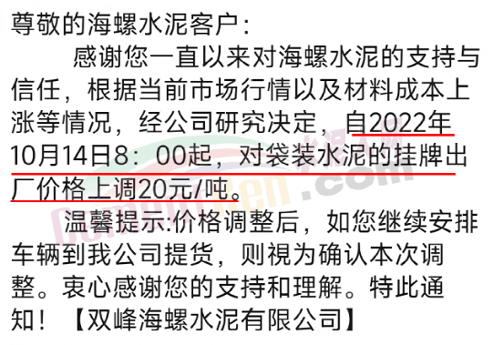 湖南雙峰海螺水泥通知自10月14日8時(shí)起,對袋裝水泥掛牌出廠價(jià)上調(diào)20元/噸。