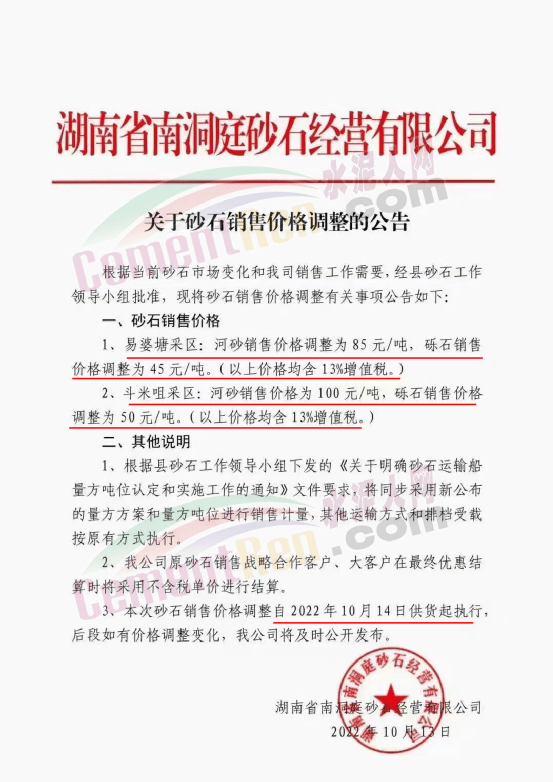 日前,湖南省南洞庭砂石經(jīng)營有限公司發(fā)布《關(guān)于砂石銷售價(jià)格調(diào)整的公告》稱,根據(jù)當(dāng)前砂石市場變化和我司銷售工作需要,經(jīng)縣砂石工作領(lǐng)導(dǎo)小組批準(zhǔn),自2022年10月14日起,易婆塘采區(qū)河砂銷售價(jià)格調(diào)整為85元/噸,礫石銷售價(jià)格調(diào)整為45元/噸。斗米咀采區(qū)河砂銷售價(jià)格為100元/噸,礫石銷售價(jià)格調(diào)整為50元/噸,(以上價(jià)格均含13%增值稅)。