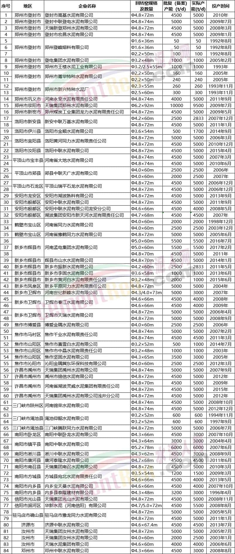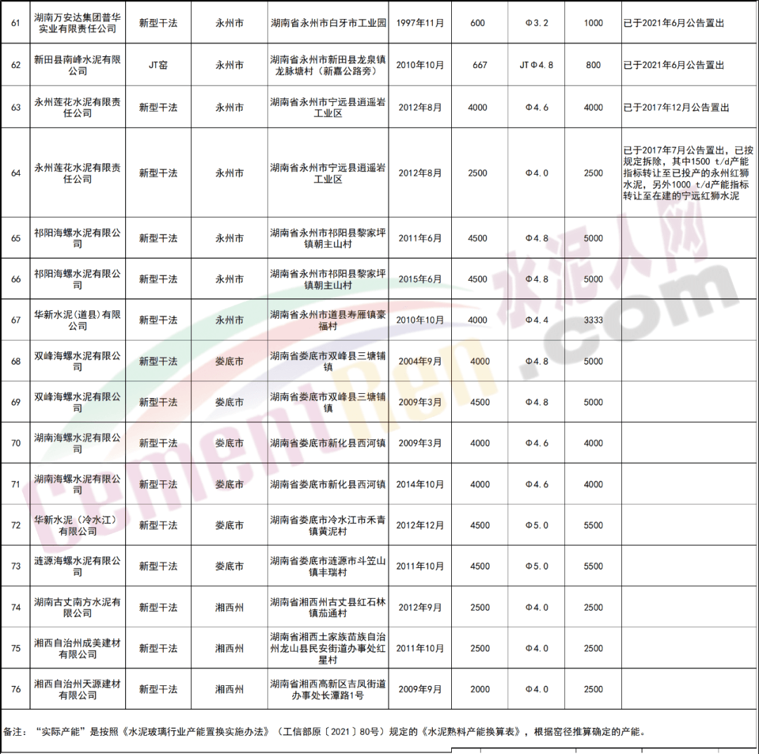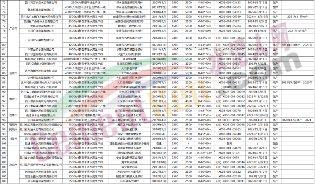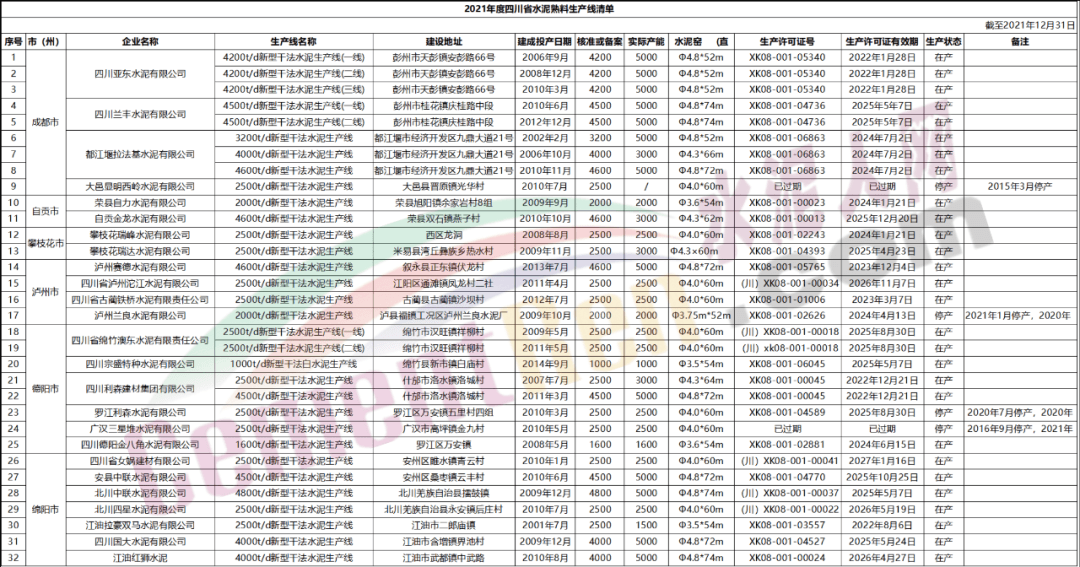 2021年度四川省熟料水泥生產(chǎn)線清單