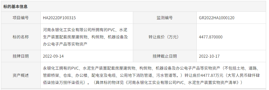 9月14日,河南省公共資源交易中心發(fā)布河南永銀化工實業(yè)有限公司所擁有的PVC、水泥生產(chǎn)裝置配套房屋建筑物、構筑物、機器設備及辦公電子產(chǎn)品等實物資產(chǎn)轉讓公告, 轉讓底價4477.87萬元。