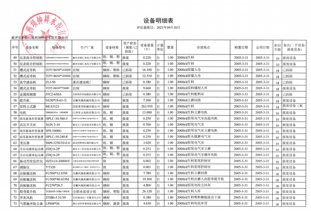 水泥人網(wǎng)注意到,設備明細中包括立磨、風機、壓縮機、減速機、篦冷機、收塵器、皮帶機、包裝機、裝車機、提升機、輸送機、噴碼機、給料機、選粉機、計量秤、空氣炮、儲氣罐、中置柜、低壓配電柜、電控柜等水泥熟料生產(chǎn)線重要組成部分。其備注狀態(tài)絕大多數(shù)為報廢設備,另有部分設備備注為已拆除。