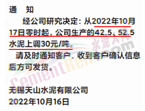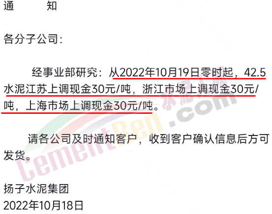 揚子水泥集團(tuán)通知,經(jīng)事業(yè)部研究,從10月19日零時起,42.5水泥江蘇上調(diào)30元/噸,浙江市場上調(diào)30元/噸,上海市場上調(diào)30元/噸。