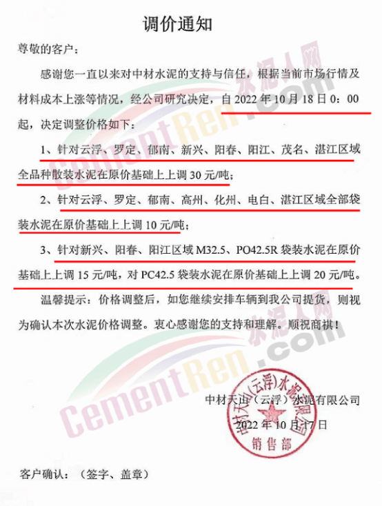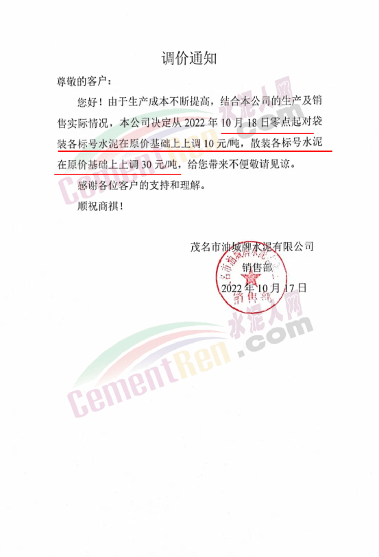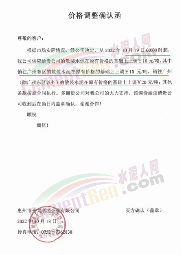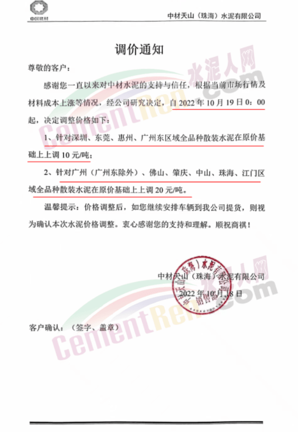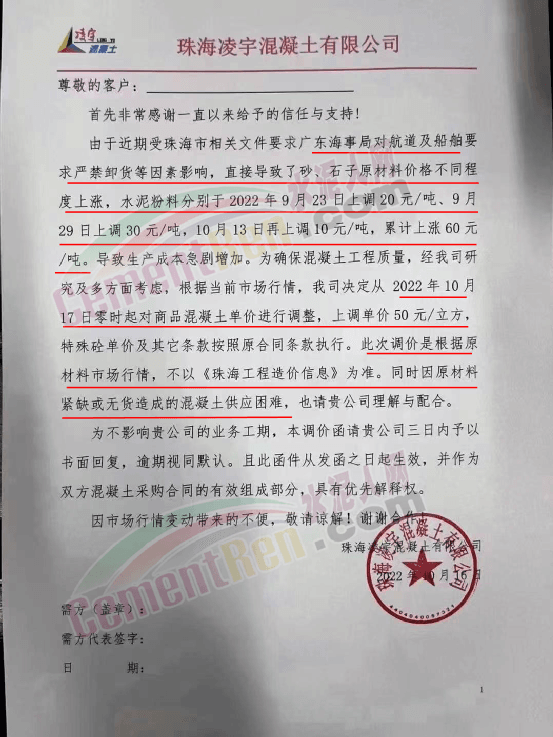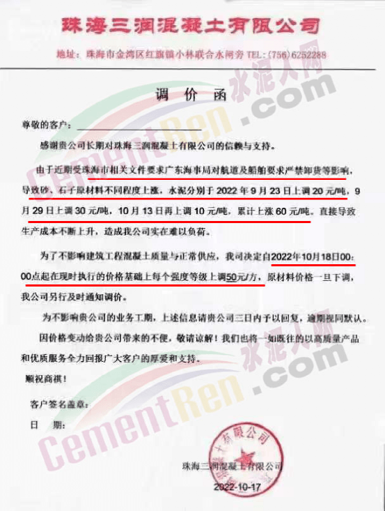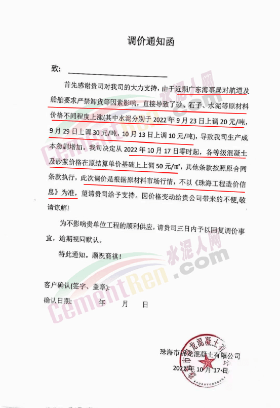 珠海三潤混凝土有限公司、珠海文冠商品混凝土有限公司、珠海市志隆商品混凝土有限公司、珠海市潤濠商品混凝土有限公司、廣東中聯(lián)新材料科技有限公司、珠海市錦龍混凝土有限公司、珠海凌宇混凝土有限公司等近十家混凝土企業(yè)通知稱,由于廣東海事局對航道及船舶要求嚴(yán)禁卸貨等因素影響,直接導(dǎo)致了砂、石子、水泥等原材料價格不同程度上漲。其中水泥分別于2022年9月23日上調(diào)20元/噸,9月29日上調(diào)30元/噸,10月13日上調(diào)10元/噸,累計上調(diào)60元/噸,導(dǎo)致了混凝土生產(chǎn)成本急劇增加。為確保建筑工程混凝土質(zhì)量不受影響,混凝土公司決定各項目各等級混凝土及砂漿價格在原結(jié)算單價基礎(chǔ)上上調(diào)50元/m³。且強(qiáng)調(diào)此次調(diào)價是根據(jù)原材料市場行情,不以《珠海工程造價信息》為準(zhǔn)。同時提到,因原材料緊缺或無貨造成的混凝土供應(yīng)困難,也請客戶理解、支持與配合。
