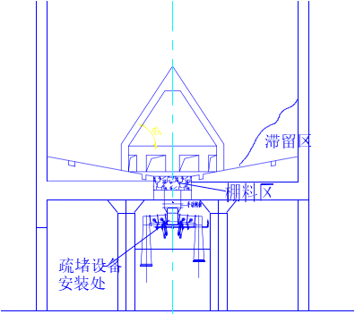 1500~2000mm,負(fù)責(zé)處理平板閘以上結(jié)拱的塊狀料甚至大塊料,中空油缸聯(lián)接羅茨風(fēng)機到減壓錐內(nèi)部可以替代部分充氣箱功能,以解決架空料的處理難題;下部在破碎機構(gòu),將溜下到破碎腔的塊狀料破碎成 2 公分左右的小塊,使得小塊能隨粉料一起被斜槽送走,解決在斜槽卸料器拐彎處堵料問題;由于本身破碎腔中自帶約 2.5 公分間隙,對正常粉料卸料沒有影響。如果發(fā)生破碎腔有堵,反而說明里面有塊狀料,這時只要開啟疏堵機,就能快速疏通。由于現(xiàn)場安裝空間所限和提供較強的破碎能力,該系統(tǒng)采用了液壓馬達(dá),羅茨風(fēng)機,與液壓捅料機構(gòu)合起來集成為一個液壓系統(tǒng)。其設(shè)備示意圖如下: