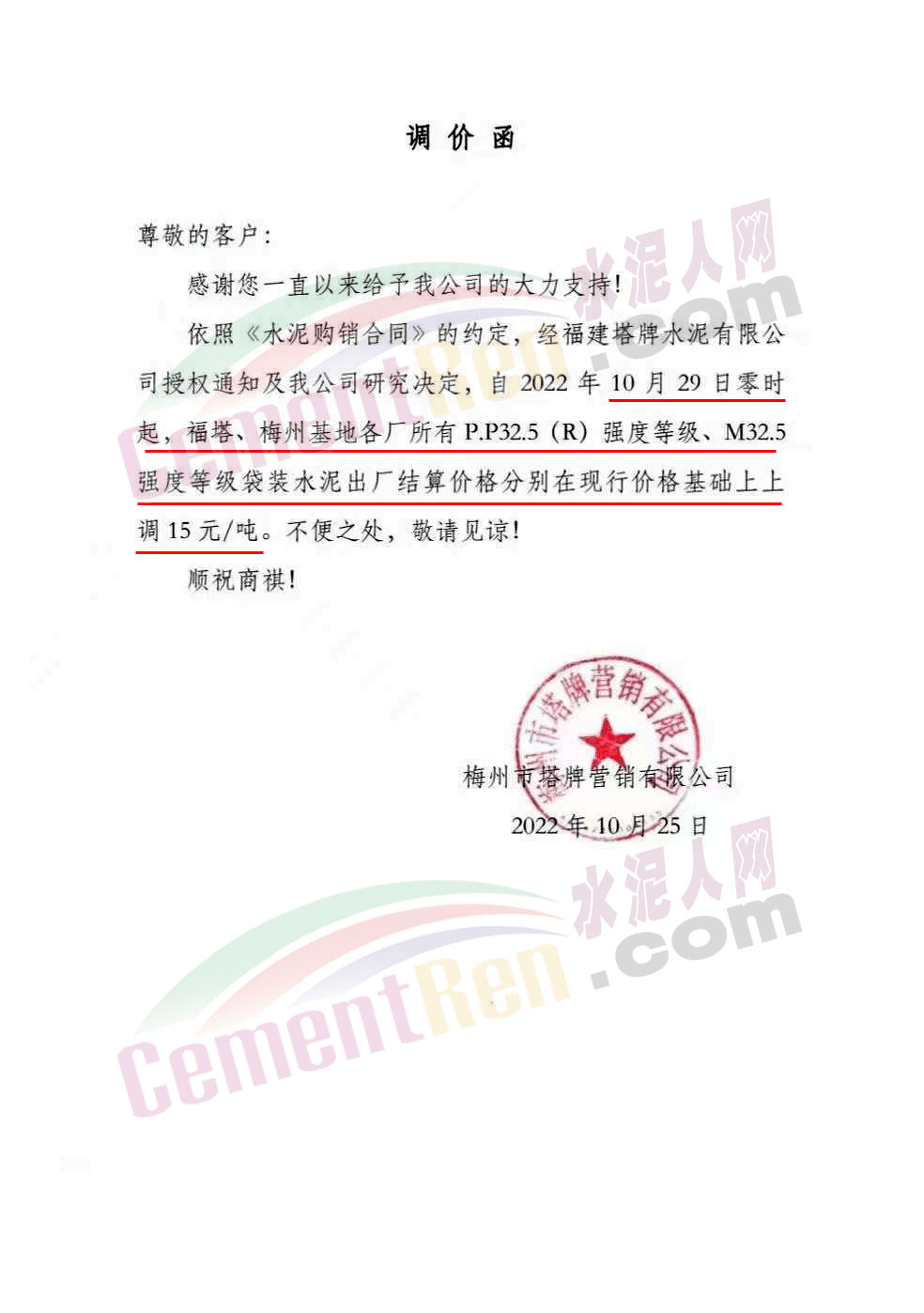 梅州市塔牌營(yíng)銷(xiāo)有限公司通知,10月29日零時(shí)起福塔、梅州基地各廠所有P.P32.5(R)強(qiáng)度等級(jí)、M32.5強(qiáng)度等級(jí)袋裝水泥出廠結(jié)算價(jià)格分別在現(xiàn)行價(jià)格基礎(chǔ)上上調(diào)15元/噸。