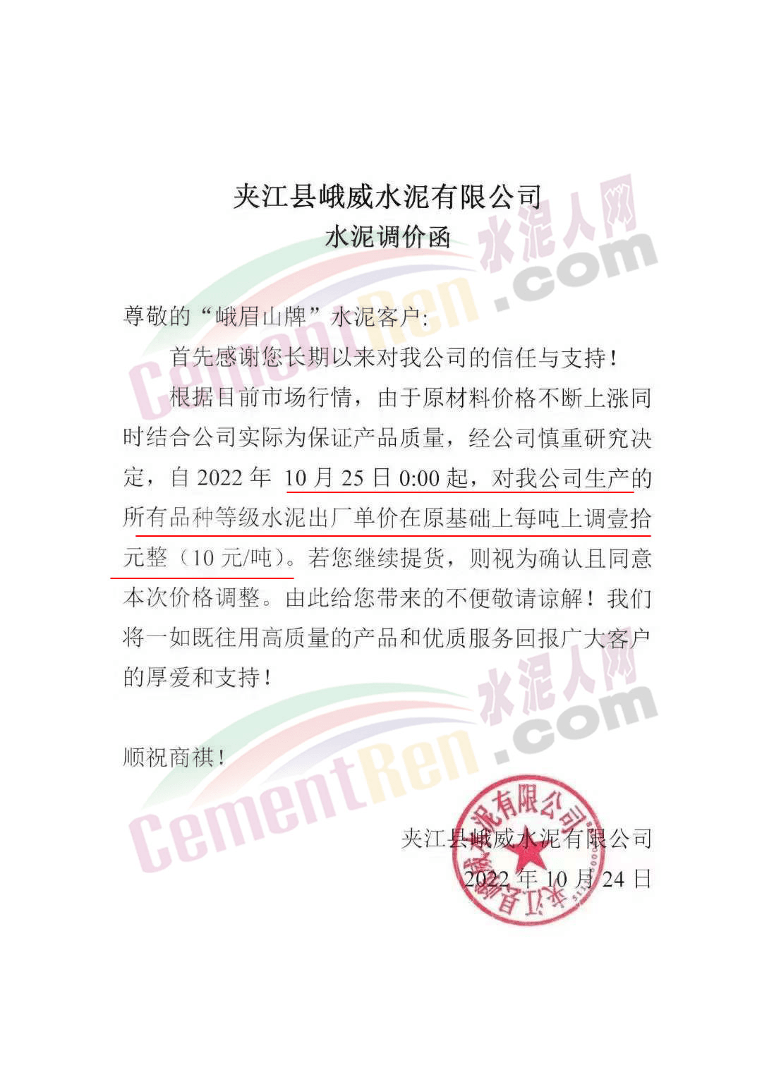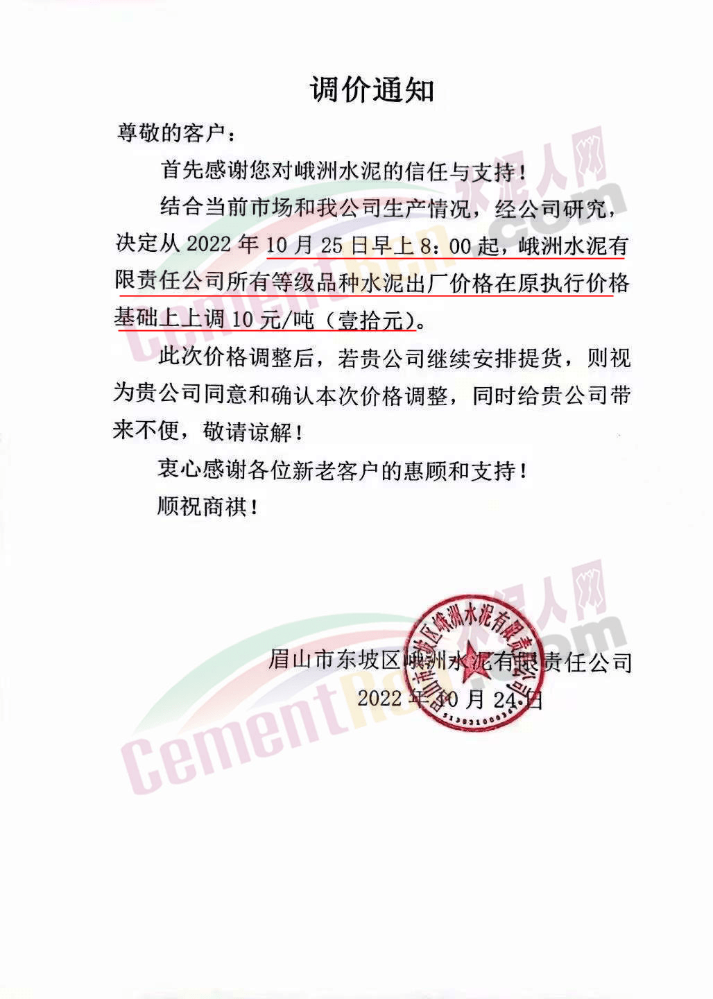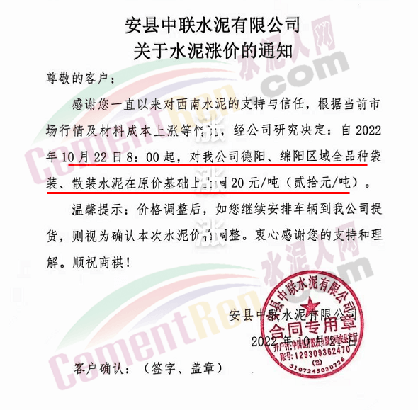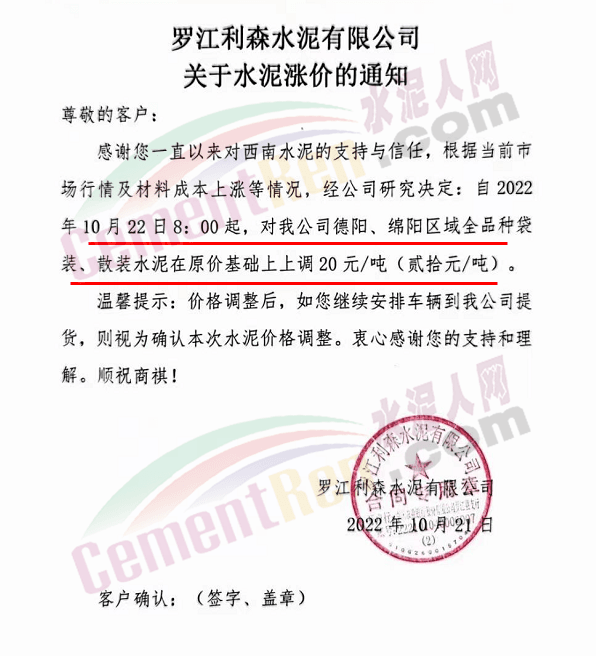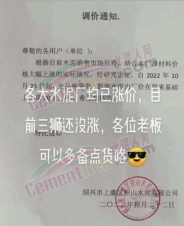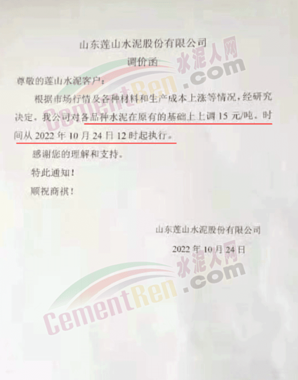 山東蓮山水泥股份有限公司通知,根據(jù)市場(chǎng)行情及各種材料和生產(chǎn)成本上漲等情況,經(jīng)研究決定,從10月24日起對(duì)各品種水泥在原基礎(chǔ)上上調(diào)15元/噸。