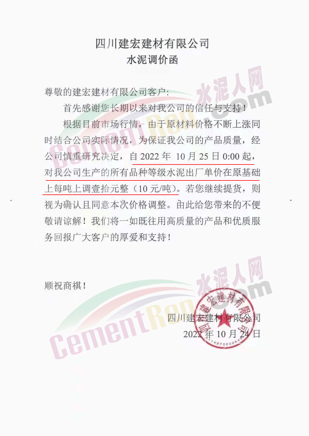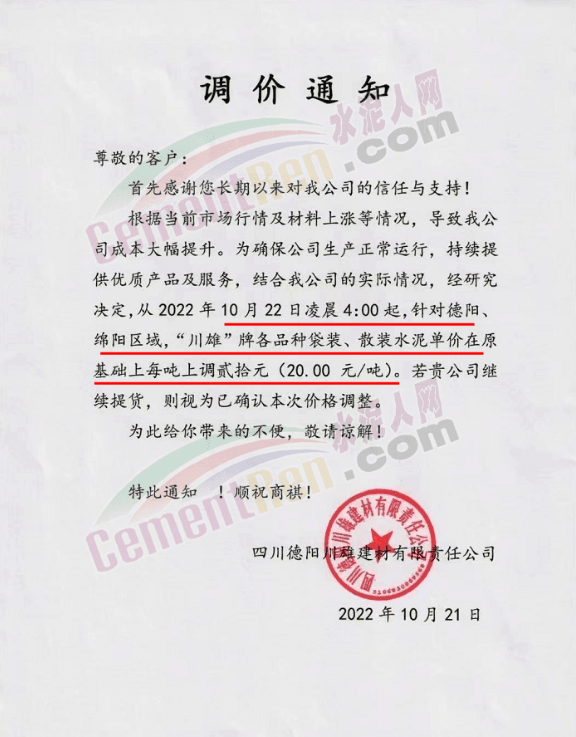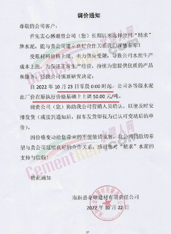 云南省大理白族自治州南澗縣金球建材有限責(zé)任公司通知,受原材料價(jià)格上漲,電力供應(yīng)受限,導(dǎo)致公司水泥生產(chǎn)成本上漲。自10月23日0時(shí)起上調(diào)50元/噸。