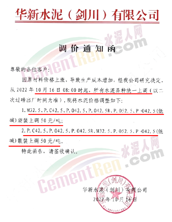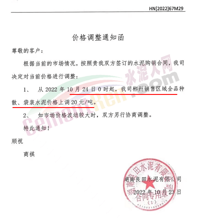 華新水泥(郴州)有限公司通知10月25日起對(duì)郴州區(qū)域所有包裝供貨價(jià)格上調(diào)20元/噸。