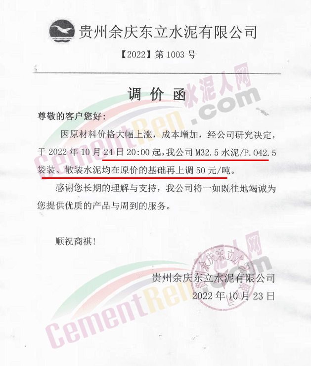 貴州區(qū)域多家企業(yè)通知,水泥價(jià)格上調(diào)50-60元/噸。經(jīng)銷(xiāo)商通知,東立漲50元/噸,其他品牌水泥漲60元/噸。