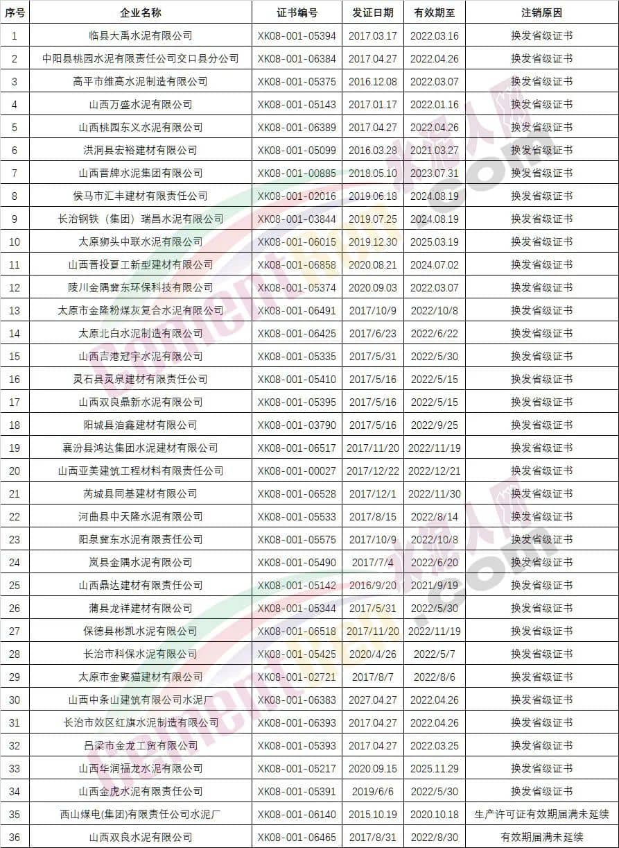 山西省共注銷36家水泥企業(yè)生產(chǎn)許可證,其中34家為換發(fā)省級下書,一家為有效期屆滿未延續(xù),一家為山西省市場監(jiān)管局公告注銷;