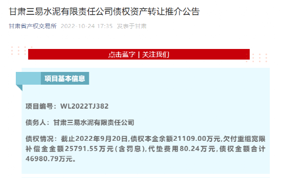 10月 24日甘肅省產(chǎn)權交易所發(fā)布《甘肅三易水泥有限責任公司債權資產(chǎn)轉(zhuǎn)讓推介公告》公告提到,甘肅三易水泥有限責任公司債權情況,截至2022年9月20日,債權本金余額21109.00萬元,欠付重組寬限補償金金額25791.55萬元(含罰息),代墊費用80.24萬元,債權金額合計46980.79萬元。