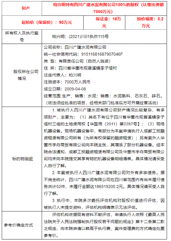 柏興明持有四川廣建水泥有限公司100%的股權公開拍賣