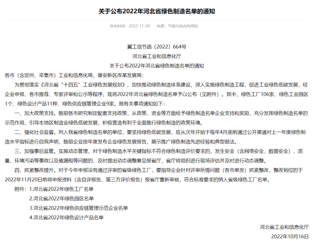 2022年河北省綠色供應(yīng)鏈管理企業(yè)名單中包含贊皇金隅水泥有限公司、唐山冀東水泥三友有限公司、唐山冀東水泥股份有限公司唐山分公司、曲陽(yáng)金隅水泥有限公司、保定太行和益環(huán)??萍加邢薰镜?家水泥企業(yè)。