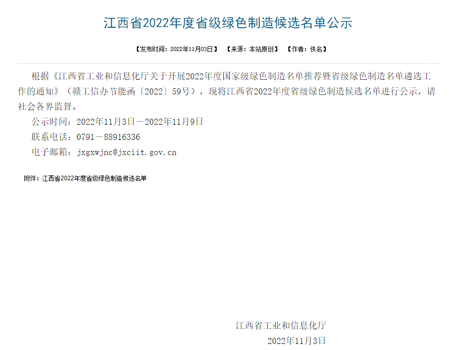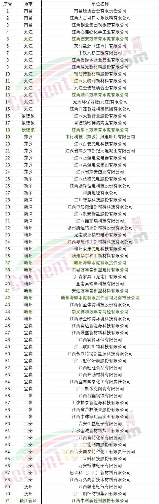11月3日,江西省工信廳公布《2022年度省級(jí)綠色制造候選名單》71家綠色工廠名單中包括江西德安萬(wàn)年青水泥有限公司、江西湖口萬(wàn)年青水泥有限公司、江西樂(lè)平萬(wàn)年青水泥有限公司、贛州海螺水泥有限責(zé)任公司、贛州海螺水泥有限責(zé)任公司龍南市分公司等5家水泥企業(yè)。