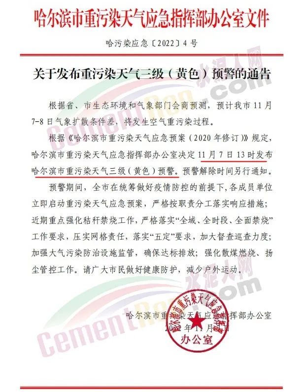 根據(jù)黑龍江省、哈爾濱市生態(tài)環(huán)境和氣象部門會商預(yù)測,預(yù)計黑龍江哈爾濱市11月7日至8日氣象擴散條件差,將發(fā)生空氣重污染過程。根據(jù)相關(guān)規(guī)定,哈市重污染天氣應(yīng)急指揮部辦公室于11月7日13時發(fā)布哈市重污染天氣三級(黃色)預(yù)警。預(yù)警解除時間另行通知。