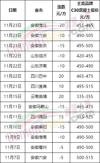 如云南曲靖市場(chǎng),主要品牌混凝土價(jià)格在11月15日通知上調(diào)20元/噸,市場(chǎng)報(bào)價(jià)335-355元/方,仍處于較低位。陜西市場(chǎng),11月22日混凝土均價(jià)454元/方,年同比下跌53元/方,跌幅達(dá)到10.52%,較上周下跌2元/方,環(huán)比下跌0.78%,整體市場(chǎng)報(bào)價(jià)偏弱運(yùn)行。