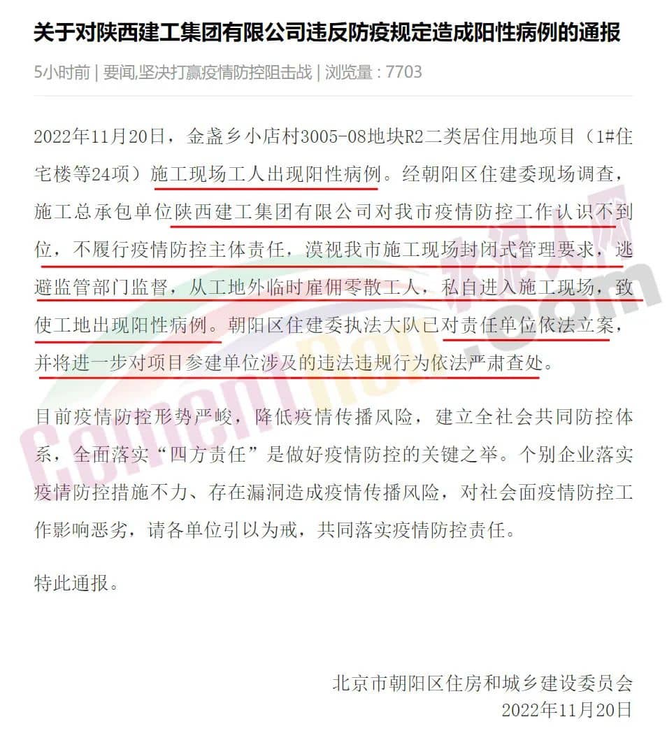 11月20日,據(jù)北京市朝陽區(qū)住建委通報,2022年11月20日,金盞鄉(xiāng)小店村3005-08地塊R2二類居住用地項目(1#住宅樓等24項)施工現(xiàn)場工人出現(xiàn)陽性病例。經(jīng)朝陽區(qū)住建委現(xiàn)場調(diào)查,施工總承包單位陜西建工集團有限公司對北京市疫情防控工作認識不到位,不履行疫情防控主體責任,漠視北京市施工現(xiàn)場封閉式管理要求,逃避監(jiān)管部門監(jiān)督,從工地外臨時雇傭零散工人,私自進入施工現(xiàn)場,致使工地出現(xiàn)陽性病例。朝陽區(qū)住建委執(zhí)法大隊已對責任單位依法立案,并將進一步對項目參建單位涉及的違法違規(guī)行為依法嚴肅查處。