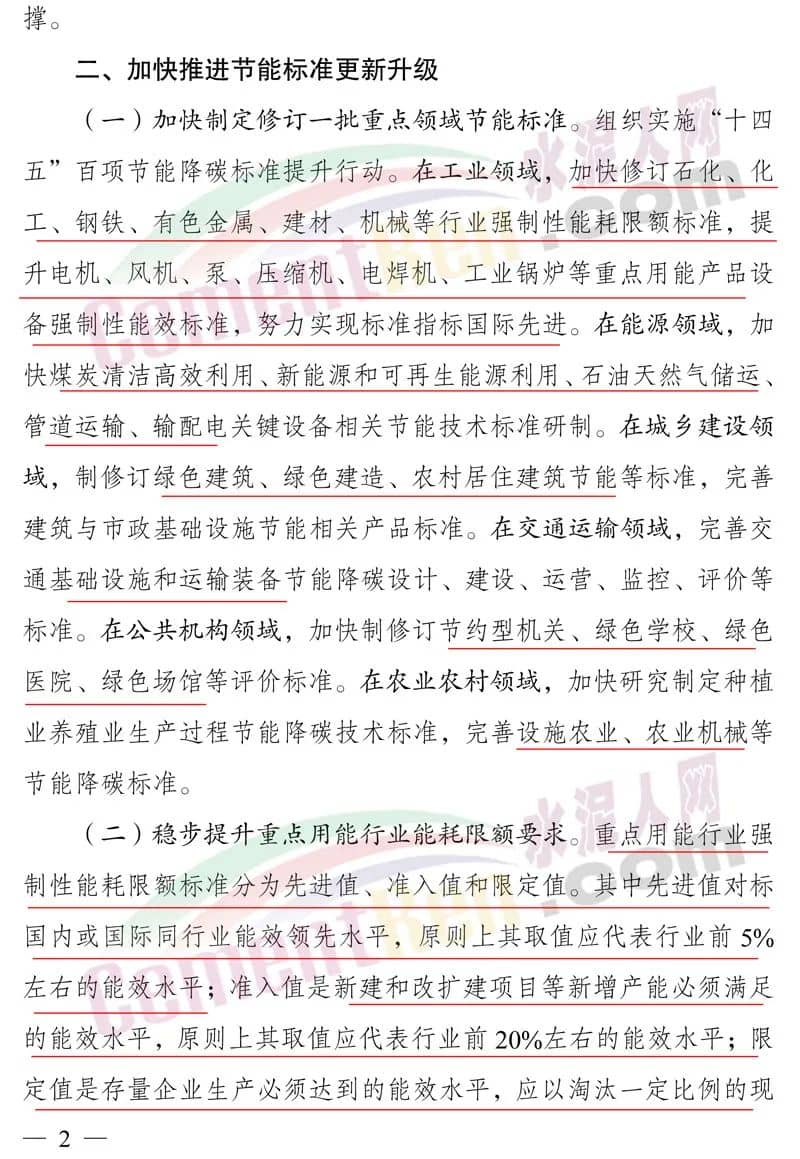 在工業(yè)領(lǐng)域,加快修訂石化、化工、鋼鐵、有色金屬、建材、機(jī)械等行業(yè)強(qiáng)制性能耗限額標(biāo)準(zhǔn),提升電機(jī)、風(fēng)機(jī)、泵、壓縮機(jī)、電焊機(jī)、工業(yè)鍋爐等重點(diǎn)用能產(chǎn)品設(shè)備強(qiáng)制性能效標(biāo)準(zhǔn),努力實(shí)現(xiàn)標(biāo)準(zhǔn)指標(biāo)國際先進(jìn)。在能源領(lǐng)域,加快煤炭清潔高效利用、新能源和可再生能源利用、石油天然氣儲(chǔ)運(yùn)、管道運(yùn)輸、輸配電關(guān)鍵設(shè)備相關(guān)節(jié)能技術(shù)標(biāo)準(zhǔn)研制。在城鄉(xiāng)建設(shè)領(lǐng)域,制修訂綠色建筑、綠色建造、農(nóng)村居住建筑節(jié)能等標(biāo)準(zhǔn),完善建筑與市政基礎(chǔ)設(shè)施節(jié)能相關(guān)產(chǎn)品標(biāo)準(zhǔn)。在交通運(yùn)輸領(lǐng)域,完善交通基礎(chǔ)設(shè)施和運(yùn)輸裝備節(jié)能降碳設(shè)計(jì)、建設(shè)、運(yùn)營、監(jiān)控、評價(jià)等標(biāo)準(zhǔn)。在公共機(jī)構(gòu)領(lǐng)域,加快制修訂節(jié)約型機(jī)關(guān)、綠色學(xué)校、綠色醫(yī)院、綠色場館等評價(jià)標(biāo)準(zhǔn)。在農(nóng)業(yè)農(nóng)村領(lǐng)域,加快研究制定種植業(yè)養(yǎng)殖業(yè)生產(chǎn)過程節(jié)能降碳技術(shù)標(biāo)準(zhǔn),完善設(shè)施農(nóng)業(yè)、農(nóng)業(yè)機(jī)械等節(jié)能降碳標(biāo)準(zhǔn)。