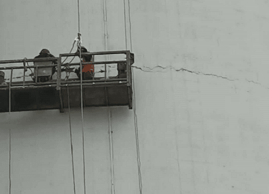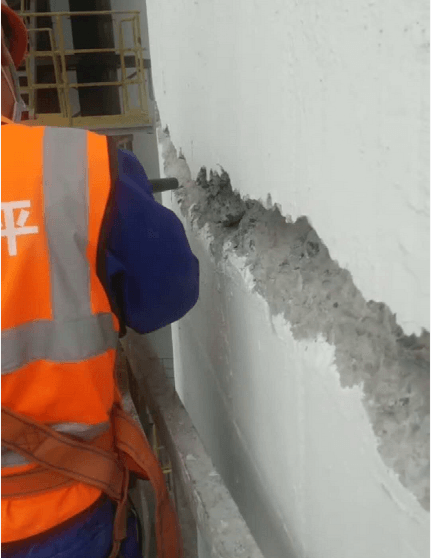 圖:混凝土水泥庫出現(xiàn)裂縫,導(dǎo)致水泥受潮板結(jié)嚴重,工人正在修復(fù)。