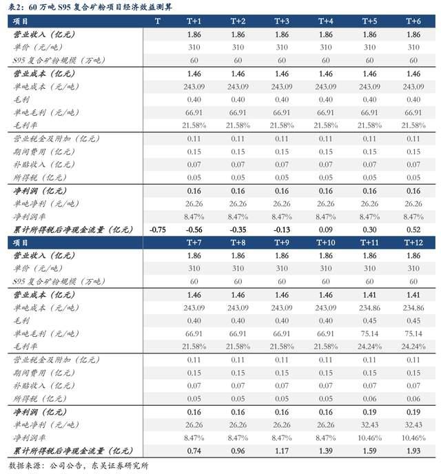 假設(shè)公司S95復(fù)合礦粉單價(jià)為310元/噸,礦粉銷售規(guī)模60萬(wàn)噸時(shí),預(yù)計(jì)全年貢獻(xiàn)營(yíng)業(yè)收入1.86億元,凈利潤(rùn)1575萬(wàn)元,毛利率21.58%,凈利率8.47%,稅后內(nèi)部回報(bào)率26.59%,具備較好的經(jīng)濟(jì)效益。同時(shí),我們根據(jù)公司已披露的營(yíng)業(yè)成本拆分里可以看到預(yù)計(jì)單噸成本在243.09元/噸,其中原材料、燃料及動(dòng)力費(fèi)、折舊攤銷費(fèi)、工資及福利費(fèi)、修理費(fèi)占比分別達(dá)74%、20%、4%、1%、1%。