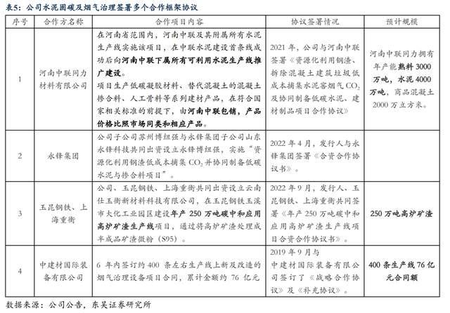 2021年公司與中聯(lián)水泥的母公司河南中聯(lián)同力材料有限公司簽訂合作協(xié)議,約定項(xiàng)目生產(chǎn)低碳膠凝材料(用于生產(chǎn)低碳水泥)、替代混凝土的混凝土摻合料、人工骨料等系列建材產(chǎn)品,在符合國(guó)家相關(guān)標(biāo)準(zhǔn)的前提下,由河南中聯(lián)同力材料有限公司包銷,且在首條中聯(lián)水泥生產(chǎn)線成功運(yùn)行后向河南中聯(lián)下屬所有可利用水泥生產(chǎn)線進(jìn)行推廣建設(shè),據(jù)河南中聯(lián)官網(wǎng)數(shù)據(jù)顯示,目前河南中聯(lián)同力擁有年產(chǎn)能熟料3000萬(wàn)噸,中聯(lián)水泥首條合作水泥熟料生產(chǎn)線產(chǎn)能為4500t/d,可見(jiàn)若復(fù)制至河南中聯(lián)所有生產(chǎn)線潛在空間較大。
