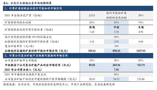 考慮公司光伏主業(yè)景氣度上行,水泥固碳項(xiàng)目進(jìn)展順利,我們測(cè)算在礦粉添加比例50%背景下,公司復(fù)合礦粉產(chǎn)品若實(shí)現(xiàn)10%、30%、85%市占率時(shí)對(duì)應(yīng)的市場(chǎng)空間分別達(dá)89.85、269.56、763.74億元,為公司2021年?duì)I業(yè)收入的11、34、96倍,潛在成長(zhǎng)空間較大。