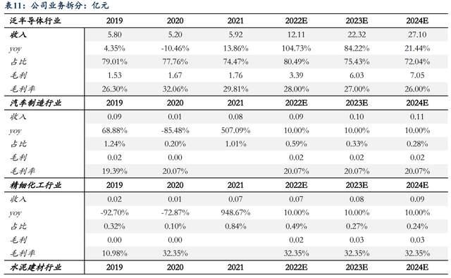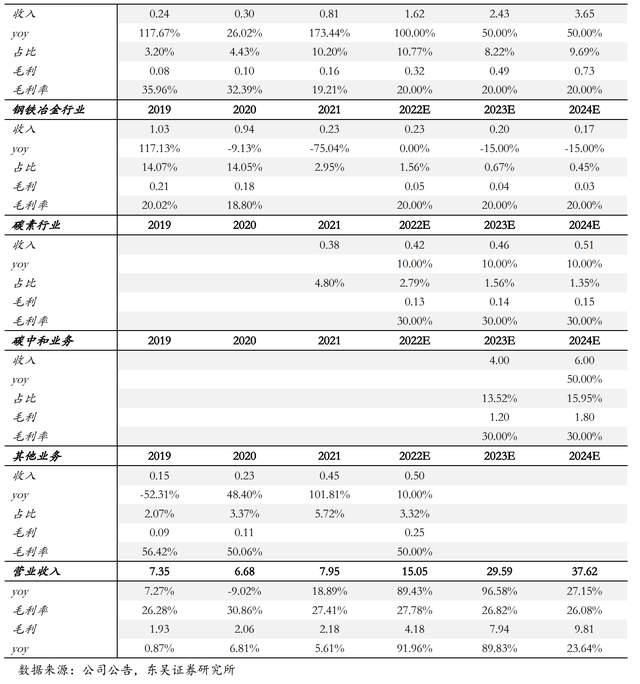 占總收入比重較小,假設(shè)鋼鐵行業(yè)2022-2024年收入增速為0%/-15%/-15%,假設(shè)碳素行業(yè)2022-2024年收入增速為10%/10%/10%,假設(shè)汽車制造、精細(xì)化工及其他行業(yè)2022-2024年收入增速維持10%左右增速,毛利率與過(guò)去三年趨勢(shì)保持一致