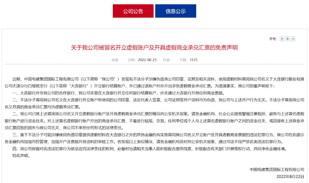 今年10月中國電建集團國際工程有限公司發(fā)布《關(guān)于我公司被冒名開立虛假賬戶及開具虛假商業(yè)承兌匯票的免責(zé)聲明》稱:發(fā)現(xiàn)有不法分子涉嫌偽造公司印章、證照及相關(guān)資料,使用虛假材料冒用公司名義于銀行開立結(jié)算賬戶,并已通過該賬戶對外開出多張?zhí)摷偕虡I(yè)承兌匯票。