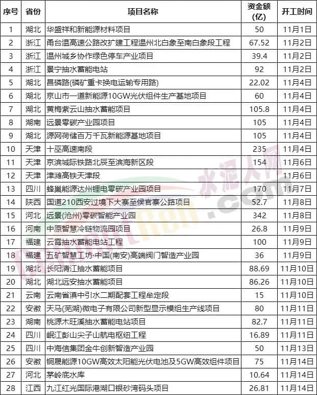 11月1日-11月15日,28個(gè)重大項(xiàng)目開工,總投資超2296億元。其中,公路3條,鐵路2條,共計(jì)總投資超509億元;蓄電站6個(gè),總投資超555億元。