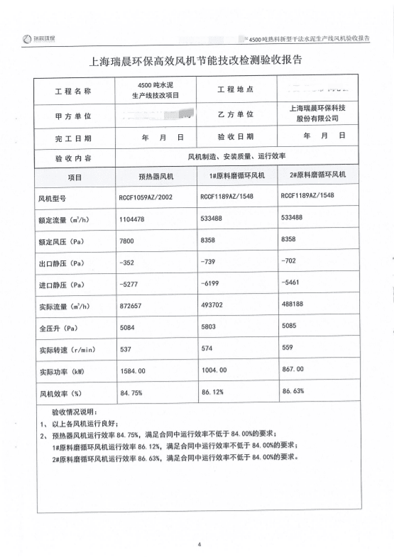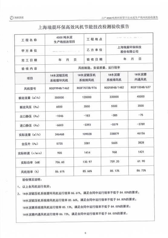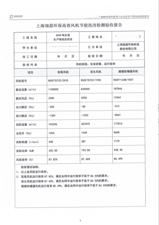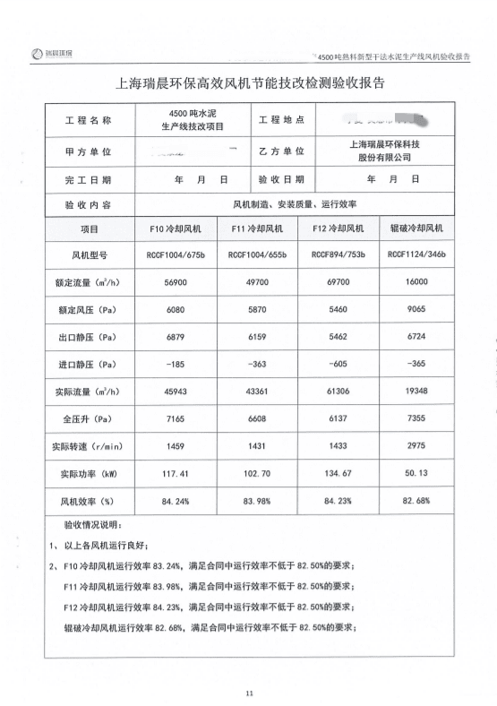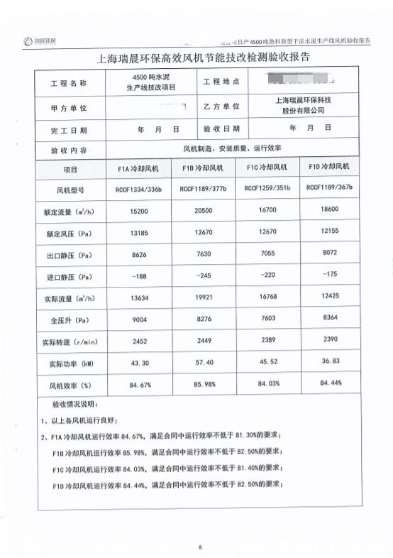 2022年8月,該水泥企業(yè)組織雙方共同對全線風(fēng)機進行了聯(lián)合驗收測試。測試結(jié)果顯示,風(fēng)機運行良好,實測效率優(yōu)于合同約定效率,達到雙方約定的驗收指標(biāo),風(fēng)機單耗低,使用效果好。