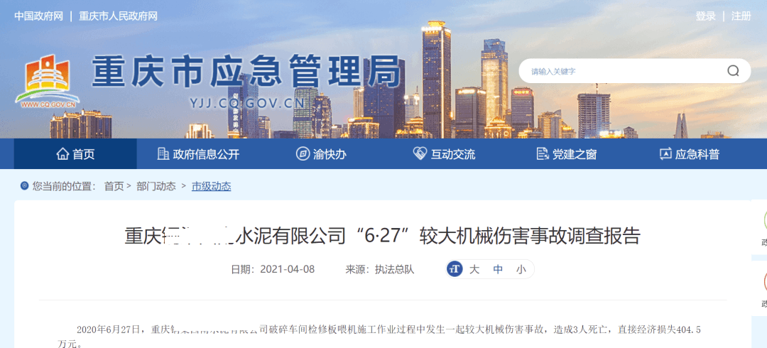 2020年6月27日,重慶銅梁某水泥有限公司破碎車間檢修板喂機(jī)施工作業(yè)過程中發(fā)生一起較大機(jī)械傷害事故,造成3人死亡,直接經(jīng)濟(jì)損失404.5萬元。