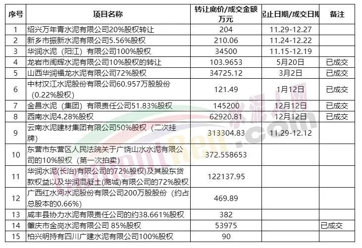 華潤水泥、萬年青水泥、中材水泥等水泥集團(tuán)企業(yè)部分股權(quán)公開交易