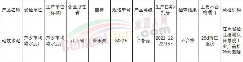 江西省市場(chǎng)監(jiān)督管理局對(duì)全省水泥產(chǎn)品質(zhì)量進(jìn)行了監(jiān)督抽查。經(jīng)檢驗(yàn),不合格產(chǎn)品1批次,涉及的不合格項(xiàng)目為28天抗壓強(qiáng)度。不合格標(biāo)稱生產(chǎn)單位為萍鄉(xiāng)市均塘水泥廠普樂夫牌M32.5水泥。
